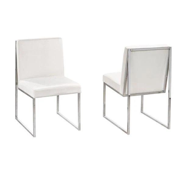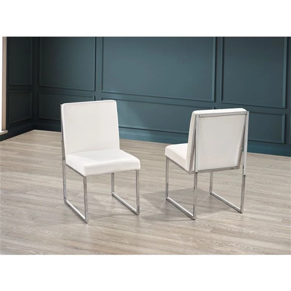 Whether pulled up to a large dining table or modest breakfast bar, the Brassex Dining Chair makes a unique style statement that’s sure to liven up your décor. Offered in versatile and sophisticated white, this set of two dining chairs has a simple elegance you’ll love showing off. With clean lines, a contemporary design, and a sleek chrome-finished frame, these dining room chairs add eye-catching style while complementing a wide range of design schemes. Complete with padded seats, a premium fabric cover and a contemporary armless design, these dining table chairs are incredibly comfortable and fit well with a variety of tables. Well-crafted and easy to clean, these low-maintenance chairs are built to last so you can enjoy them for years to come.