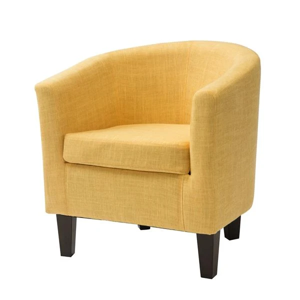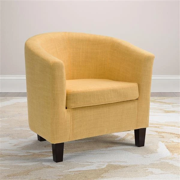 Style your home with this inviting chair from the CorLiving® Collection. Sink effortlessly into comfort with the LAD-788-C tub chair with its gentle curved back and sloping arms. Wood frame construction gives a sturdy foundation of support while the durable and stylish yellow fabric upholstery is complimented with double stitched detailing. Revive your living space with this versatile chair, offering great value and a timeless look that makes the most of your room setting.