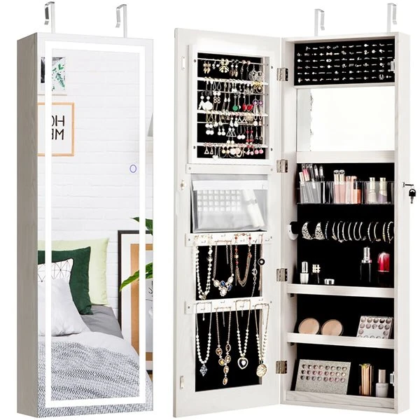 This stylish and practical jewelry armoire with full size mirror and LED lights is an attractive piece of furniture. It is specially designed for all your valuables, and keeps your jewelry organized. The most amazing thing is that it has spacious and smart storage spaces. There are 6 rows for rings, 1 small mirror, 3 boxes for makeup, 1 rod for scarves and 3 storage shelves for cosmetics. In addition, this cabinet has good moisture resistance performance and the surface uses a very good quality coating. It is not only environmentally friendly, but also effectively prevents mould.