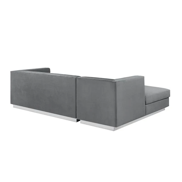 This velvet chaise sectional sofa brings a soft refinement to the boundaries of your living room, office or foyer. This simple yet attractive item provides a centrepiece colour and design that blends easily with your main furniture to create a vibrant and warm indoor place to come home to. Straight lines, square arms, soft velvet handmade upholstery, cozy foam filling and a minimalist solid base with a metal finish give this piece a unique modern feel. The frame is comprised of a combination of solid wood and MDF, which makes the structure sturdy and durable. The high-quality sinuous springs installed inside the piece guarantee you a comfortable seating.