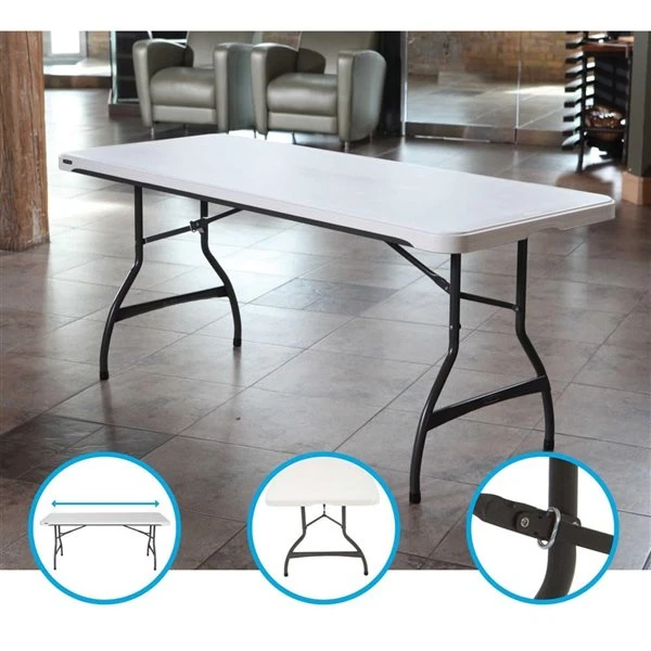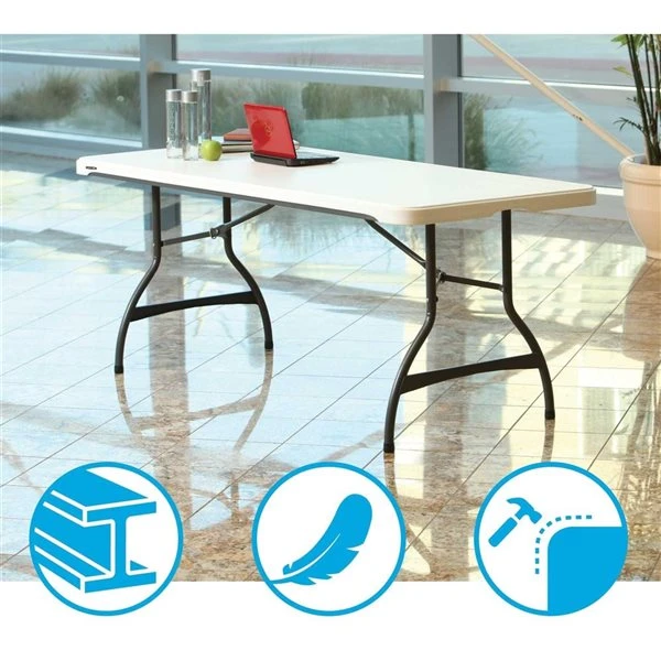 Introducing Lifetime’s new line of Premium Black & Silver Office Furniture. Our 6-Foot Commercial Folding Tables are constructed of high-density polyethylene and are stronger, lighter and more durable than wood tables. The innovative nesting design allows tables to fit snuggly together, and helps keep stacked tables straight and sturdy. This ingenious architecture saves 20% on the stacking height compared to previous models. Our tables are UV-protected with all-weather construction for both indoor and outdoor use. The patented steel frame design provides a sturdy foundation and is protected with a powder-coated, weather-resistant finish. Our High Strength Low Alloy (HSLA) Steel creates a lighter table with increased strength and stability. Built for the rigours of heavy-duty commercial use, Lifetime Folding Tables exceed challenging BIFMA standards and are backed by a ten-year warranty.