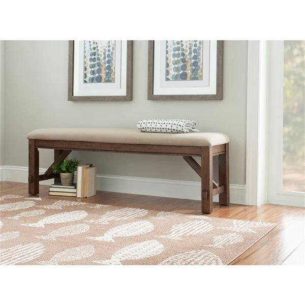 Outfit any room with this perfect bench. It features traditional straight lines and a simplistic style. A solid tan fabric in a basketweave construction covers a plush, comfortable seat. It has a durable rubberwood, MDF and ash veneer construction in a rustic umber finish, which delivers an updated farmhouse vibe. Matching table and chairs available. Some assembly required.