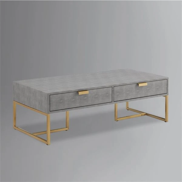 Lavish your home with this chic coffee table that instantly turns into a conversation piece with its classic but contemporary design. Boasting its exquisitely tailored shagreen texture, this coffee table is a unique addition to every modern home. This eye-catching piece of art is crafted from high quality MDF, stainless steel and topped with a luxurious faux shagreen fabric. This modern coffee table also features 2 spacious drawers for organizing your living room essentials: remotes, magazines, newspapers and more.