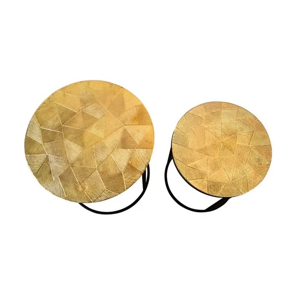 A remarkable set of nesting tables is the perfect addition to your favourite room or empty hallway space. An outstanding metal table design top that will beautifully decorate or display decor in your home. With a triangle lined pattern to add geometric detail to the room. Contrasting gold and black for a bold yet astonishing statement.