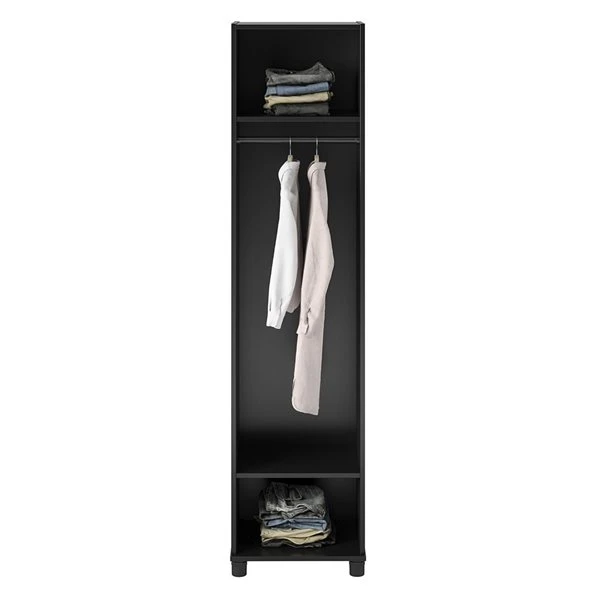 Made of laminated particle board with a sleek black finish, the Lory mudroom cabinet is both attractive and affordable. The interior of this cabinet features 1 lower adjustable shelf for shoes or bins, a middle shelf perfect for backpacks or purses, a coat rack, and an upper shelf for hats, gloves and other essentials.
