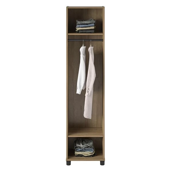 Made of laminated particle board and finished in a natural faux wood grain, the Lory mudroom cabinet is both attractive and affordable. The interior of this cabinet features 1 lower adjustable shelf for shoes or bins, a middle shelf perfect for backpacks or purses, a coat rack, and an upper shelf for hats, gloves and other essentials.